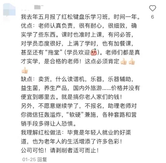 小红书网友的遭遇,折射出红松小课的模式矛盾:该网友报名键盘乐课程一年,虽对授课老师的教学质量表示认可,但饱受产品推销困扰(读谱机、乐器、益生菌、养生产品、国内外旅游项目,价格无任何优势)。网友对红松小课“以服务老年学员为名、实则从中牟利”的运营模式产生质疑。