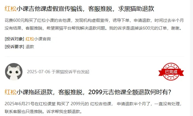 类似的案例还有很多,在黑猫投诉平台上:网友被诱导下单的吉他课程,退款申请被客服推诿,半个月无法得到解决;也有网友购买的吉他课程,半个月一直都没有得到处理。
