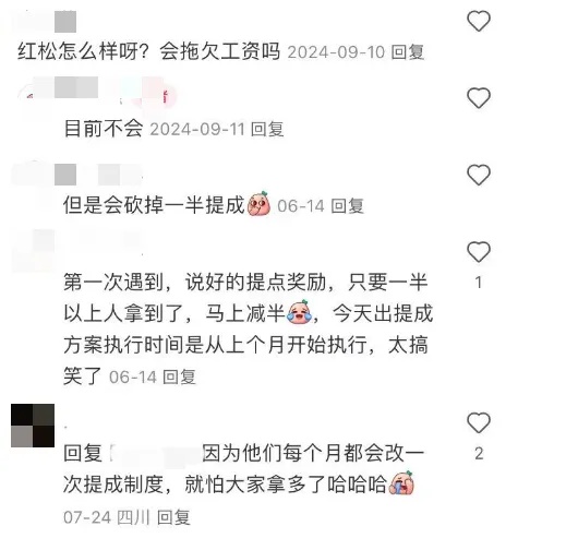 更关键的是,当前红松小课内部员工不满加剧。天眼查显示,其运营主体北京枫锦同圆软件科技有限公司,涉及多起劳动合同纠纷与劳动争议。小红书爆料称,红松小课内部员工对薪资政策的吐槽更是此起彼伏——公司会以“超过半数人达标”为由,直接砍掉一半提成。几乎每月都在修改制度,试图限制员工拿到高薪。员工积极性下降直接影响获客与服务质量,进一步加剧新客开发难度,很容易形成“获客难→员工不满→服务差→更难获客”的恶性循环。