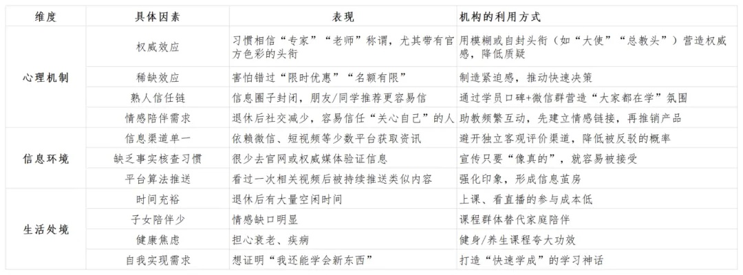 信息层面上,中老年群体缺乏多渠道验证信息的习惯与能力,面对机构输出的内容,缺乏反向质疑能力。