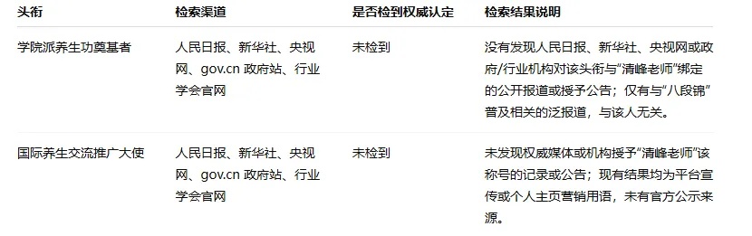 三是其宣称的“国际养生交流推广大使”和“学院派养生功奠基者”,GPT-5在检索官媒、政府网站以及相关协会网站后,均未检索到对老师身份的权威认定。
