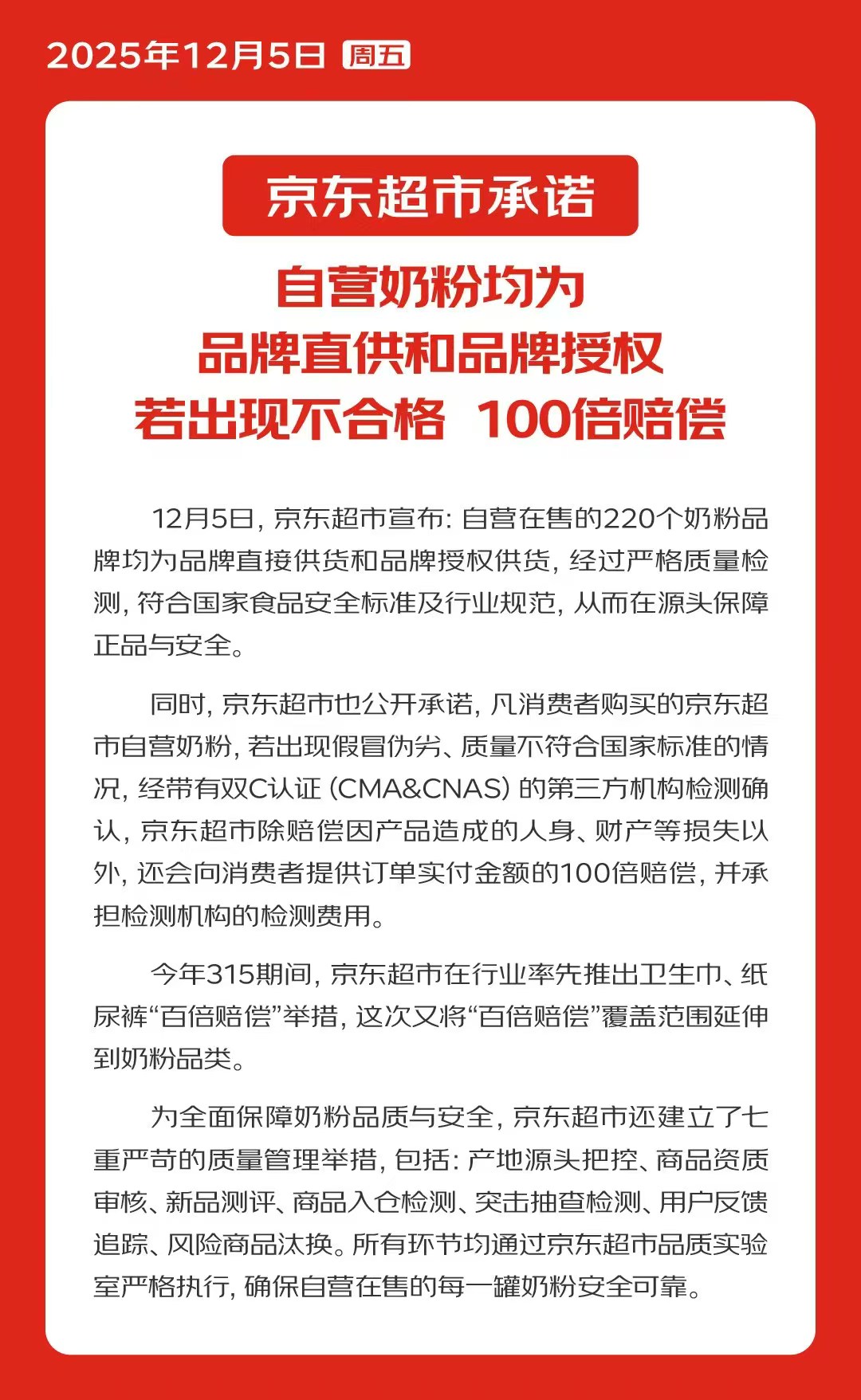 同时,京东超市也公开承诺,凡消费者购买的京东超市自营奶粉,若出现假冒伪劣、质量不符合国家标准的情况,经带有双C认证(CMA&CNAS)的第三方机构检测确认,京东超市除赔偿因产品造成的人身、财产等损失以外,还会向消费者提供订单实付金额的100倍赔偿,并承担检测机构的检测费用。