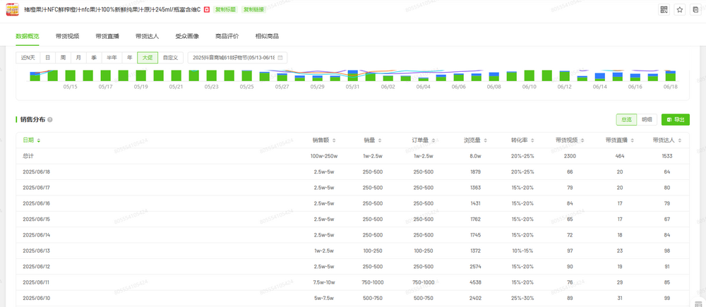 深知初级农产品“靠天吃饭”的天然局限,褚氏农业凭借自身在橙子原料上的优势,跨界切入软饮料赛道,推出了褚橙NFC鲜榨果汁、褚橙茉莉花味橄榄枝等产品。不过,从市场表现来看,其软饮料业务仍处于前期摸索阶段:飞瓜数据显示,2025年618大促期间,褚橙NFC鲜榨果汁的销售额仅在100万—250万元区间,尚未形成规模化效应。