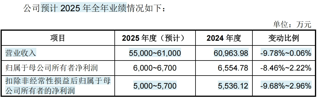 不过,2025年前三季度,公司营业收入和扣非净利润同比下滑约2%和14%;公司预计2025年全年实现营业收入5.50-6.10亿元,同比变化-9.8%至0.1%,扣非归母净利5.00-5.70亿元,同比变动-10%至3%。