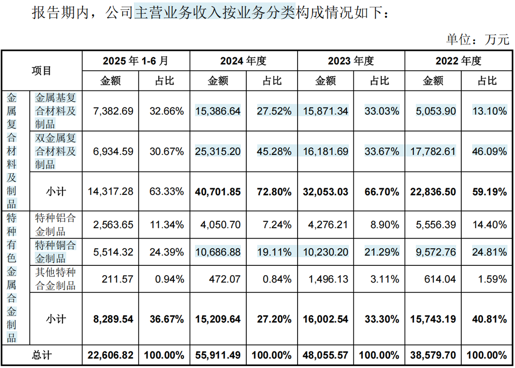 公司主营业务为金属复合材料及制品、特种有色金属合金制品的研发、生产和销售。2024年度,公司实现营业收入6.10亿元,扣非后归母净利润0.55亿元。