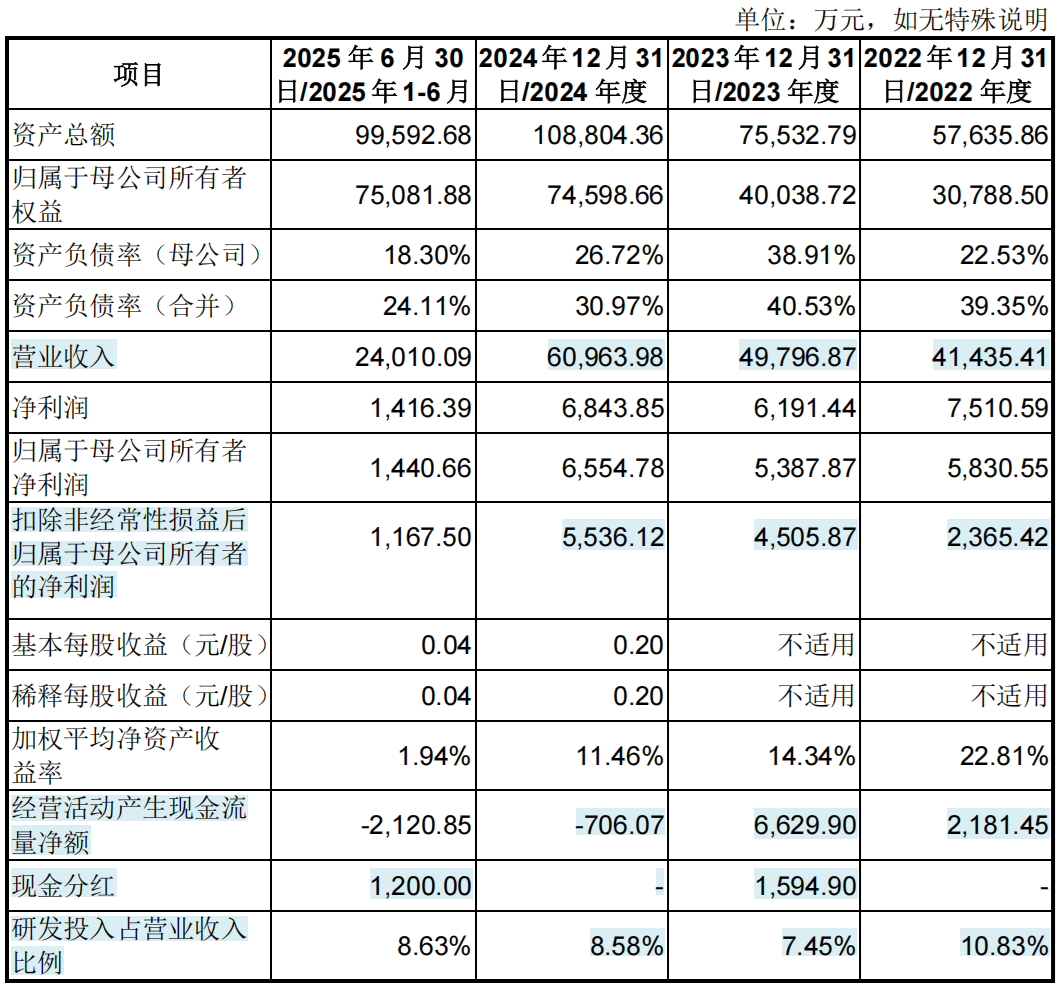 2022-2024年,公司业绩保持增长,营业收入分别为4.14亿、4.98亿和6.10亿元,复合增长率约20%,扣非后归母净利润分别为0.24亿、0.45亿和0.55亿元。