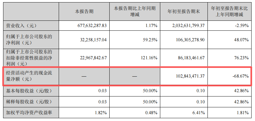 贝因美2025年第三季度报告显示,年初至报告期末,其经营活动产生的现金流量净额同比下降68.67%。这个百分比和净利润同比增长48.07%,扣非净利润同比增长76.23%的增长形成明显背离。