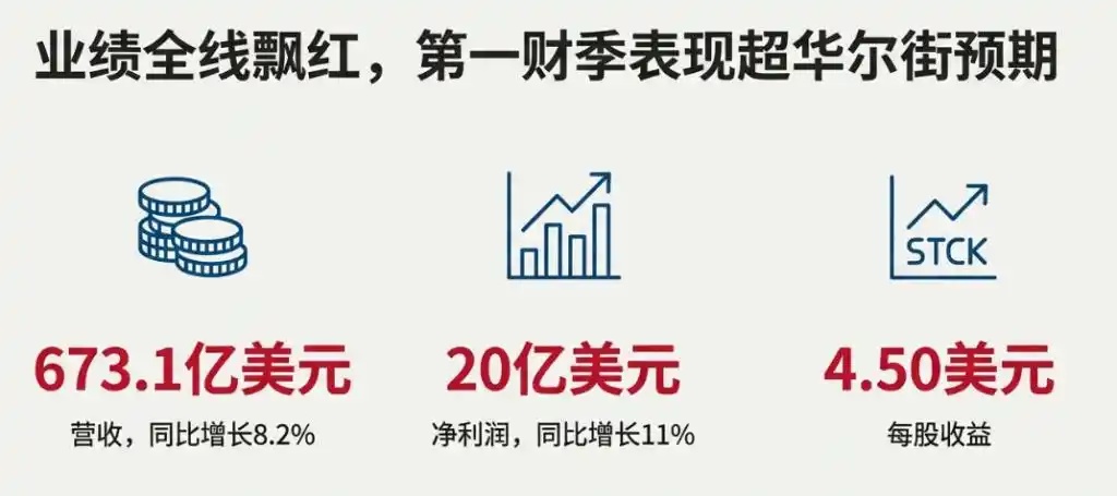 - 财务表现强劲:第一财季营收673.1亿美元,同比增长8.2%,每股收益4.50美元,均超华尔街预期;净利润20亿美元,同比增长11%。