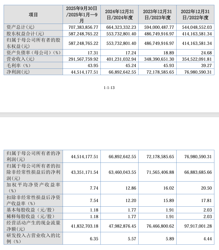 报告期内(2022年至2025年三季度),佳宏新材的营业收入分别为3.55亿元、3.48亿元、4.01亿元、2.92亿元;净利润分别为7698.06万元、7217.86万元、6689.26万元、4451.42万元。