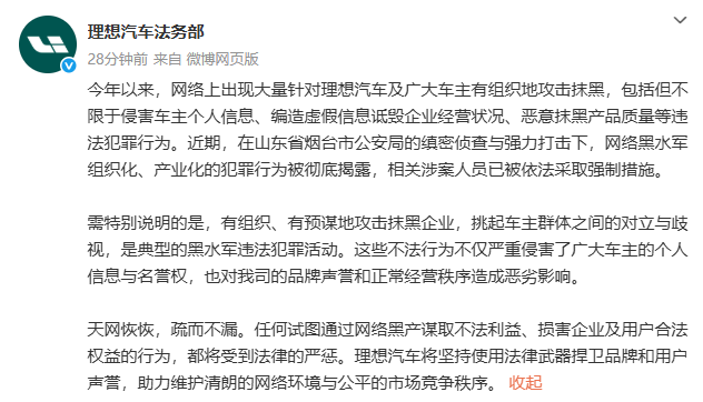 理想汽车表示,有组织、有预谋地攻击抹黑企业,挑起车主群体之间的对立与歧视,是典型的黑水军违法犯罪活动。这些不法行为不仅严重侵害了广大车主的个人信息与名誉权,也对我司的品牌声誉和正常经营秩序造成恶劣影响。