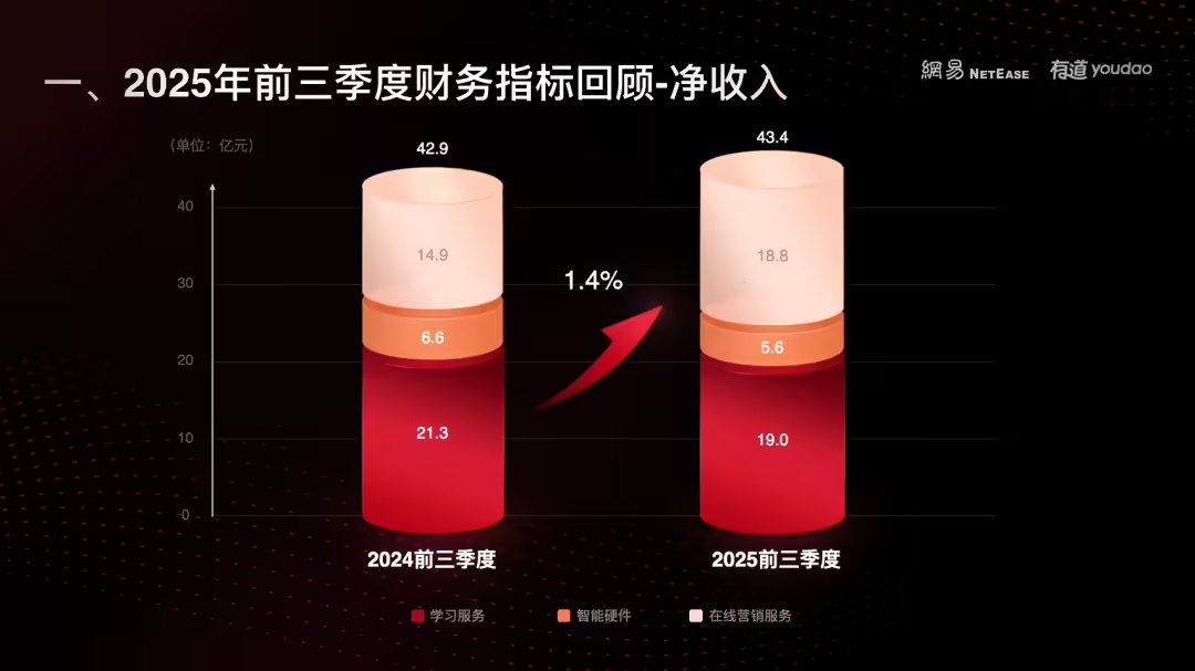 网易有道 CEO 周枫表示,今年前三季度,有道累计净收入 43.4 亿元,同比增长 1.4%。在业务增长的基础上,包括销售费用、管理费用在内的运营费用同比下降,带动了经营利润提升至 1.6 亿元,同比增长 149.2%。