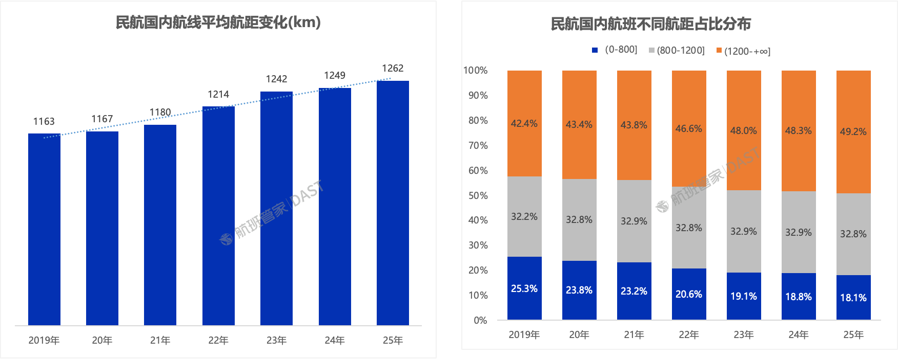 2025年民航国内航线平均航距达1262km,2019年为1163km,年均增长约16.5km,且800公里以下航线航班占比逐年走低,从2019年的25.3%下滑至2025年的18.1%,转移至1200公里以上航线,其航班占比从42.4%提升至49.2%。这反映出国内长线文旅需求的升级,以及民航业“向长距聚焦”的结构性调整。