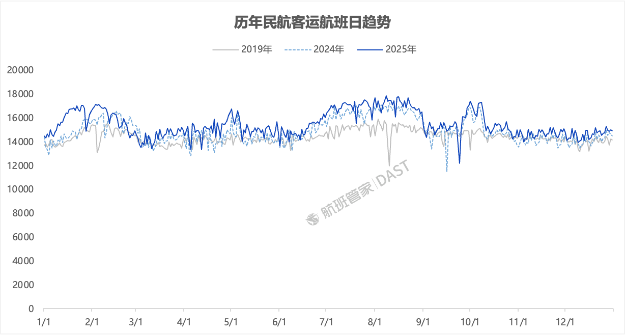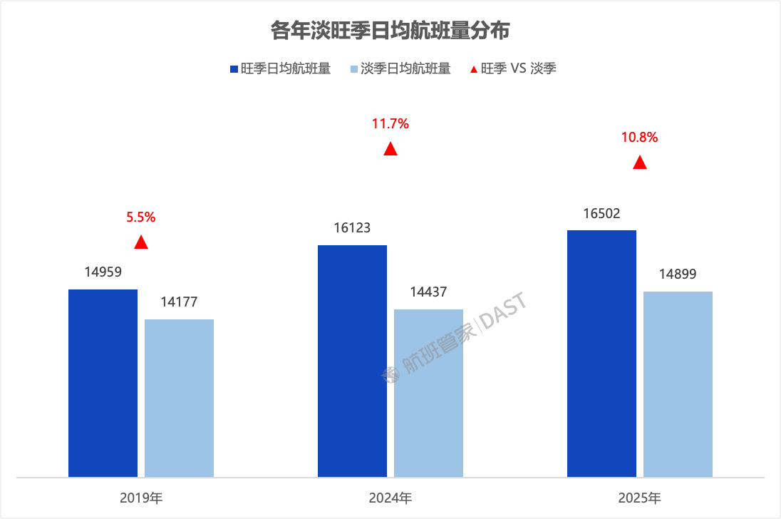 从供给端观察,历年旺季(春运、暑运、国庆等周期)与淡季(非旺季周期)日均航班的差异化明显。旺季普遍要高于淡季,2019年旺季日均航班要高于淡季5.5%,近两年这一差异化有扩大的趋势,淡旺季差异扩大至10%以上,2025年旺季日均航班高出淡季1600余班次。