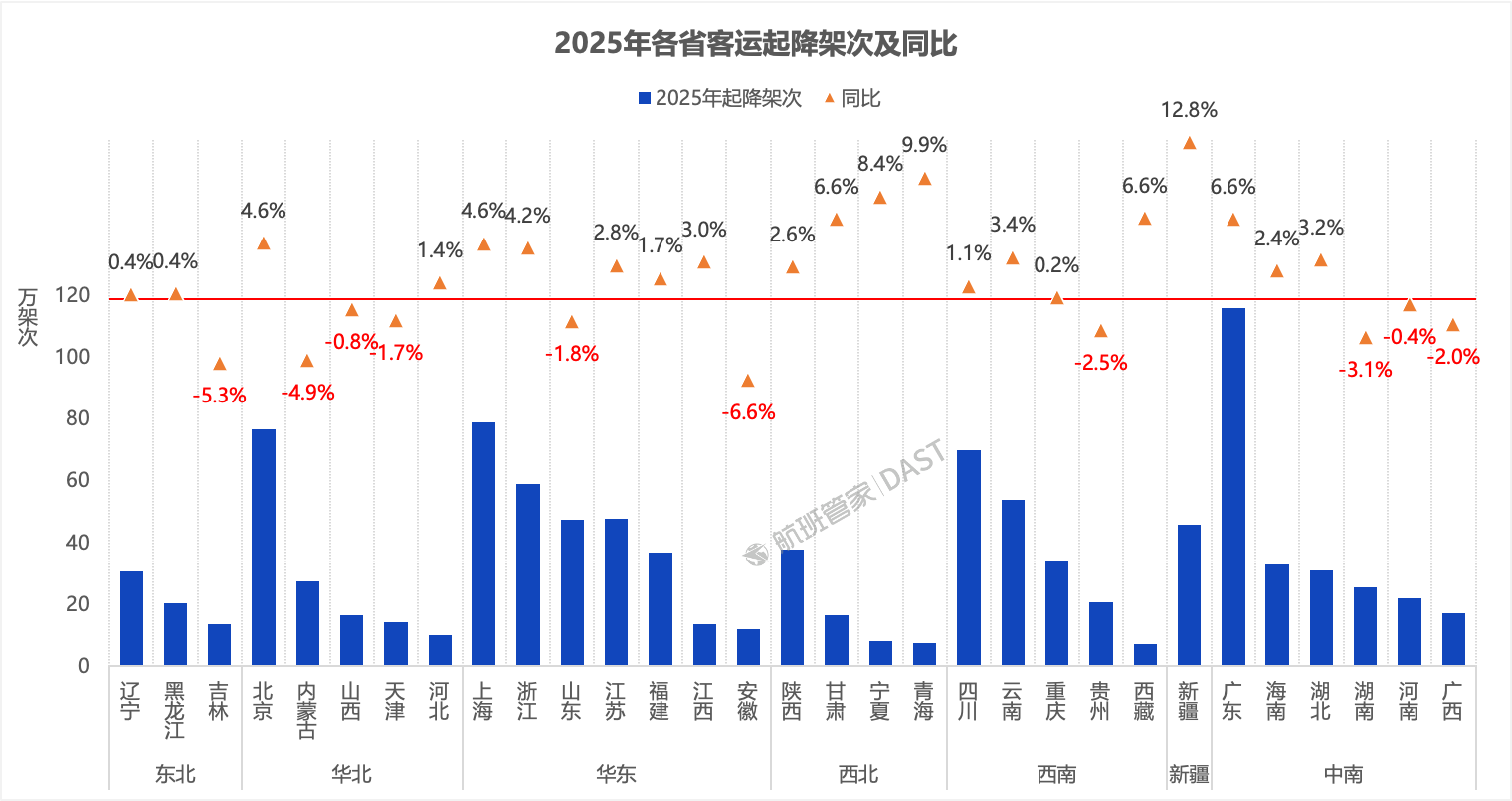 按航线划分,国内航线(含地区)完成旅客运输6.9亿人次,同比2024年增长3.8%、同比2019年增长17.8%;国际航线完成旅客运输0.8亿人次,同比2024年增长22%、同比2019年增长7.6%(仅含境内航司承运旅客量,不含外航)。