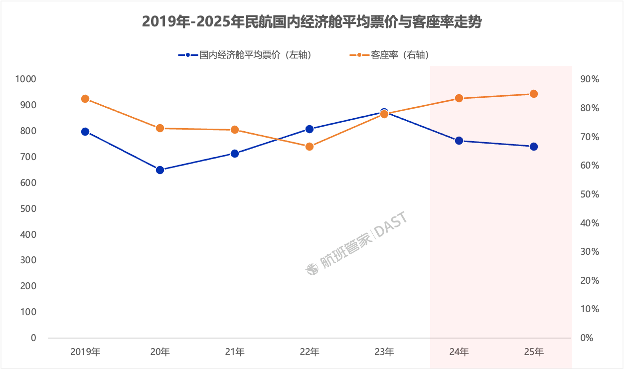 2023年国内旅客运输量已超2019年水平,客座率也不断走高。这背后是航空公司普遍采取的“以价换量”策略,2024年经济舱平均票价同比下滑12.7%,2025年依旧延续低票价策略,全年经济舱平均票价达740元,同比下滑2.9%,呈现“旺丁不旺财”的现象。