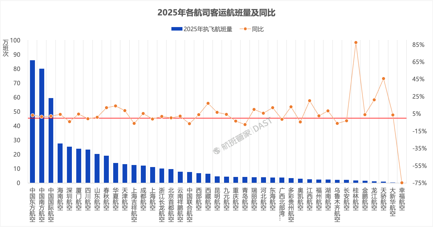 2025年境内客运航司41家(按航司二字码统计),其中三大航执飞占比达42.1%。同比来看,29家航司航班同比正增长,其中桂林航+87.4%(同期部分时间段处于停航状态)、藏航+17.2%、华夏+14.2%、春秋+12.1%等航司增幅靠前,三大航皆小幅增长;12家航司航班同比负增长,其中幸福航-74.6%(4月底全面停航)、青岛航-7.5%、联合航-6.4%、乌鲁木齐/吉祥航-6.1%等航司降幅较大。