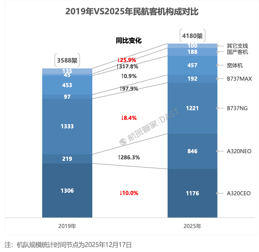 截至2025年末,我国民航客机机队规模达4180架,较2019年的年均复合增长率为2.6%,整体增速放缓,呈现三大趋势: