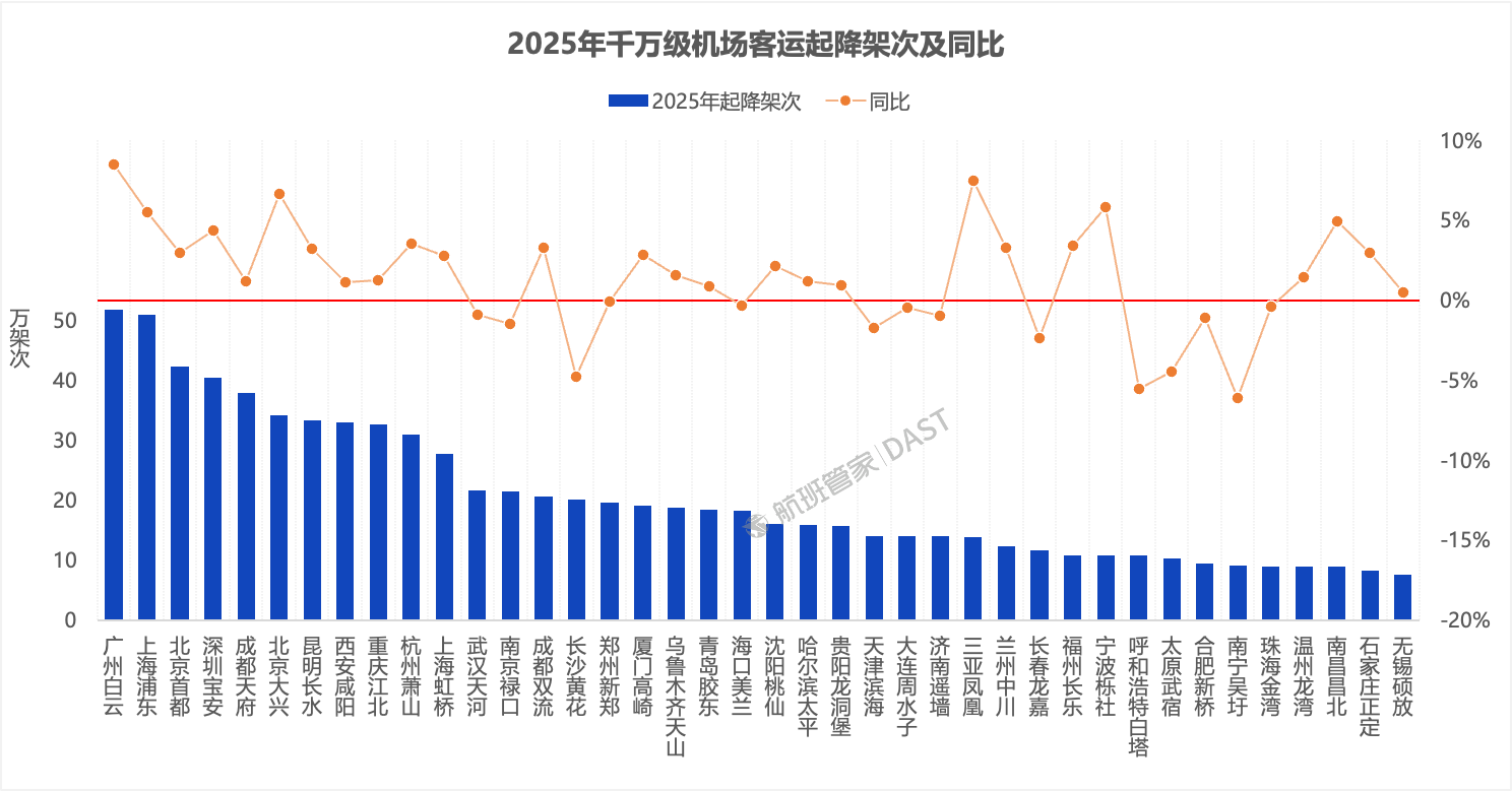 2025年国内40座千万级机场(以2024年吞吐量为依据)客运起降824.6万架次,同比增长2.1%,占比国内机场客运起降总量的78.9%,同比微降0.3个百分点。