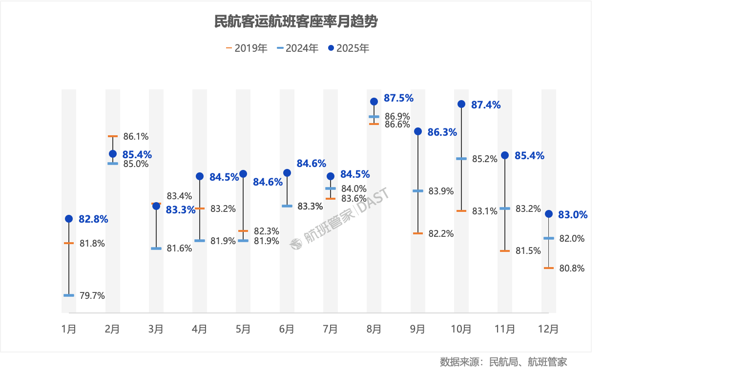 2025年民航运输整体客座率预计达84.9%,高出2024年1.6个百分点,高出2019年1.7个百分点,创年度新高。从月趋势上观察,全年保持较高的客座水平,各月客座率皆在82%以上,峰值出现在暑运8月份,达87.5%,其次是十月87.4%,各月份客座率皆要高于2024年,高出0.4-3.1个百分点不等。