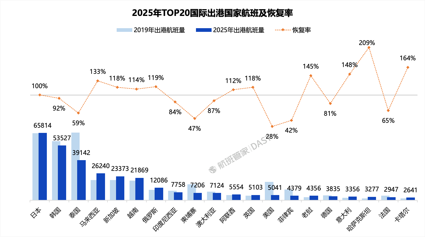 2025年TOP20通航国家中,日本、马来西亚、新加坡、越南、俄罗斯、阿联酋、英国、老挝、意大利、哈萨克斯坦、卡塔尔恢复率皆超100%,美国、菲律宾、柬埔寨、泰国恢复相对较低,分别为28%、42%、47%、59%。
