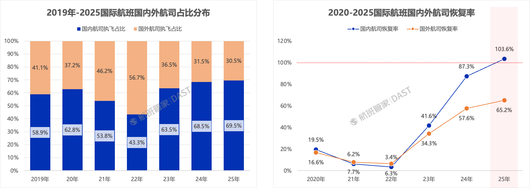 在航班恢复上,差异更为悬殊,2025年国内航司的国际航班量已恢复至2019年的103.6%,而国外航司仅为65.3%。这标志着后疫情时代的中国民航国际市场,已形成由国内航司主导驱动、恢复强劲,而国外航司参与度降低、恢复滞后的新格局。