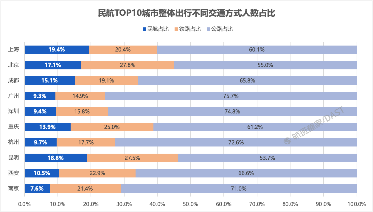 从这些城市整体出行渠道上观察,公路仍是主要交通工具,各城市出行占比皆在50%以上,其次是铁路;对比来看上海、昆明、北京等城市民航出行拥有较高的占比,接近2成,广深、南京较低,占比不足10%。