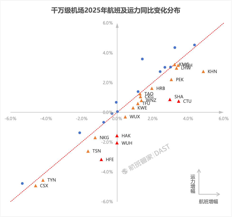 二是以双流、虹桥机场为代表,运力增幅远低于航班增幅。2025年双流机场航班起降架次同比增长3.5%,可供运力仅增长0.7%,主因在于宽体客机的减少投入,其中A350执飞占比下滑3.6个百分点,导致机场整体班均运力同比下降5座/班次。