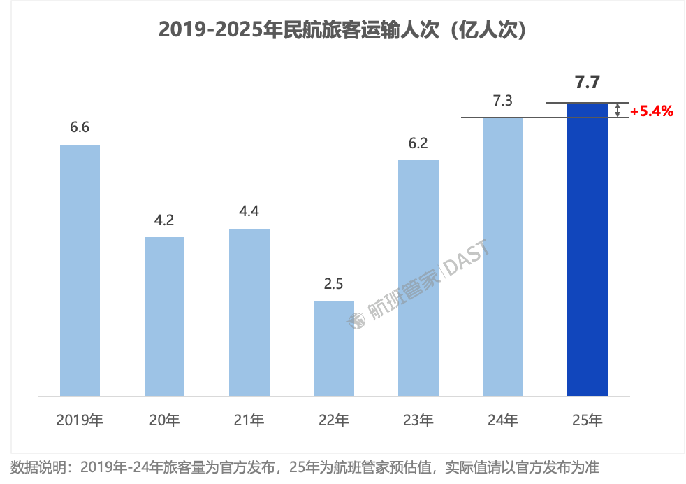 2025年我国民航预计完成旅客运输7.7亿人次,同比2024年增长5.4%,同比2019年增长16.6%,旅客运输创历年新高。按航线划分,国内航线(含地区)完成旅客运输6.9亿人次,同比2024年增长3.8%、同比2019年增长17.8%;国际航线完成旅客运输0.8亿人次,同比2024年增长22%、同比2019年增长7.6%(仅含境内航司承运旅客量,不含外航)。
