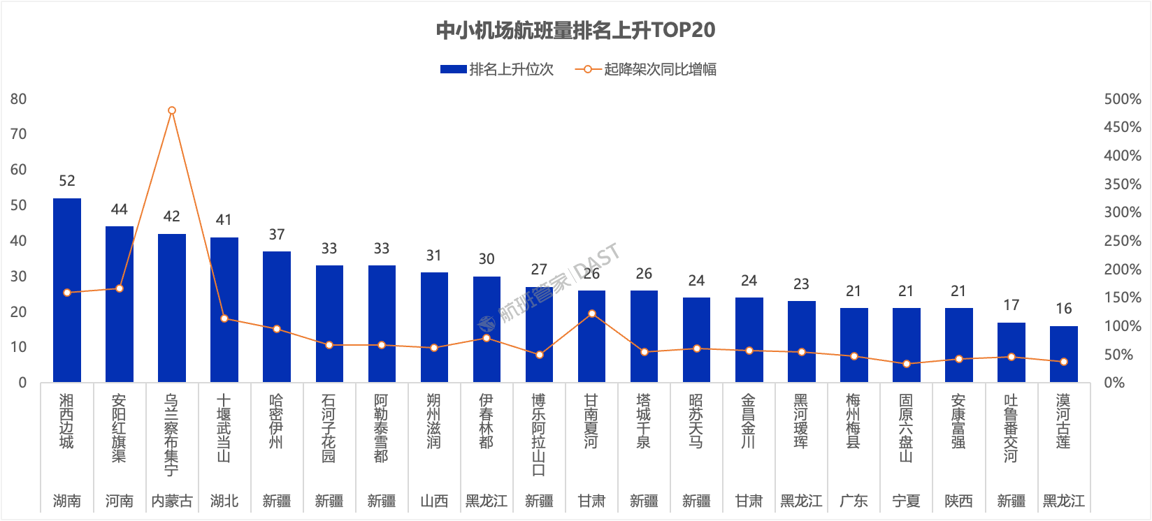 为观察城市受欢迎程度的变化,我们对比了中小机场(非千万级)的航班量排名(2024 vs 2025)。下图展示了名次跃升最快的TOP20机场,它们皆为年吞吐量200万以下的支线机场。这表明,以小众旅游目的地为代表的下沉市场,正成为新的机会蓝海。
