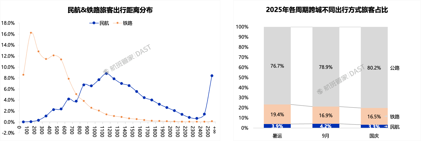 其二,来自公路的分流。节假日期间自驾出行趋势愈发明显。以2025年国庆为例,跨城流动中公路占比高达80.2%,要高于往日水平。对于家庭或小团体而言,自驾的显性成本(油费、过路费)相比民航(全价机票、机场交通费)具有显著的经济性优势。