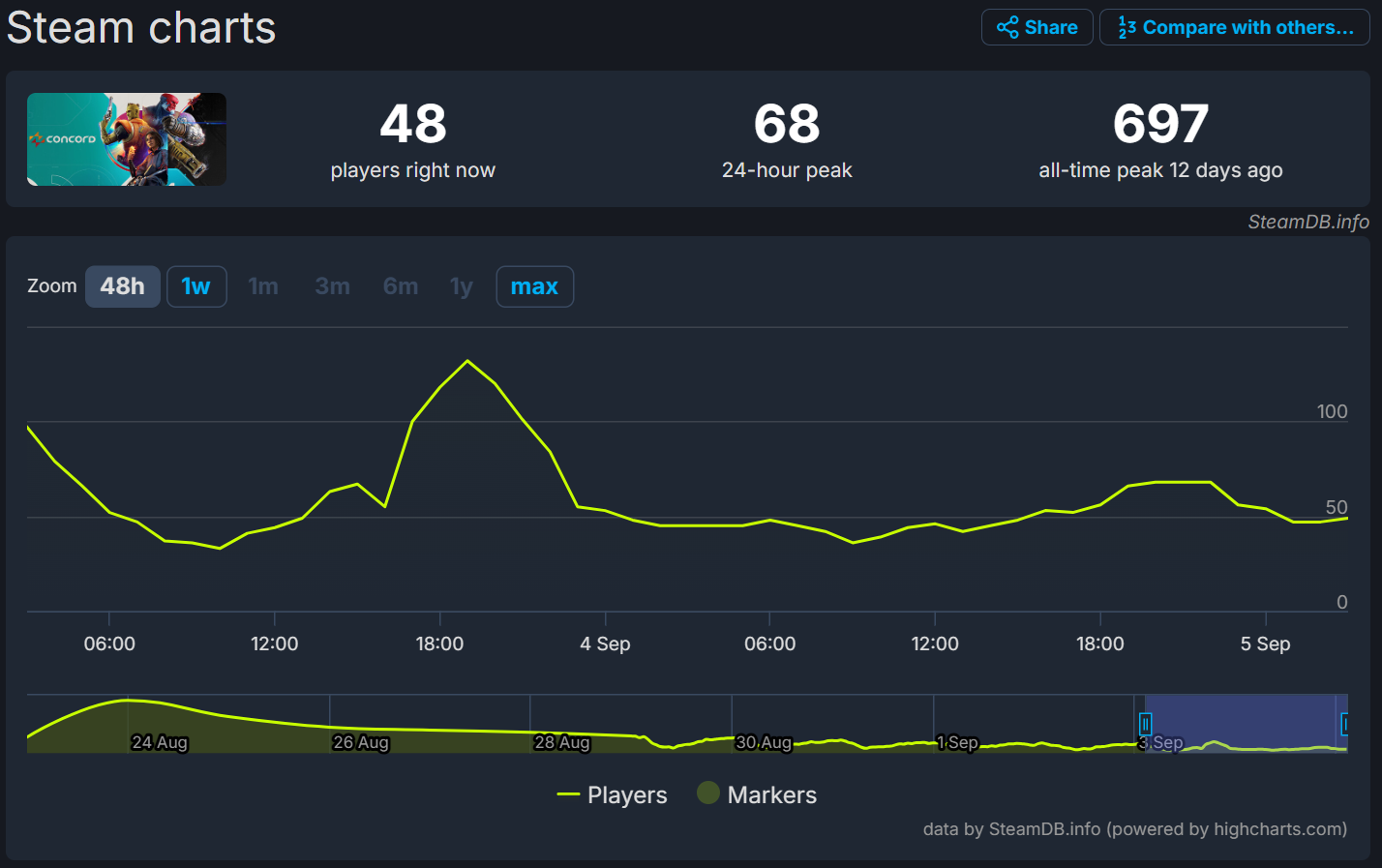 《星鸣特工》正式版在线人数峰值不足700 图源:SteamDB