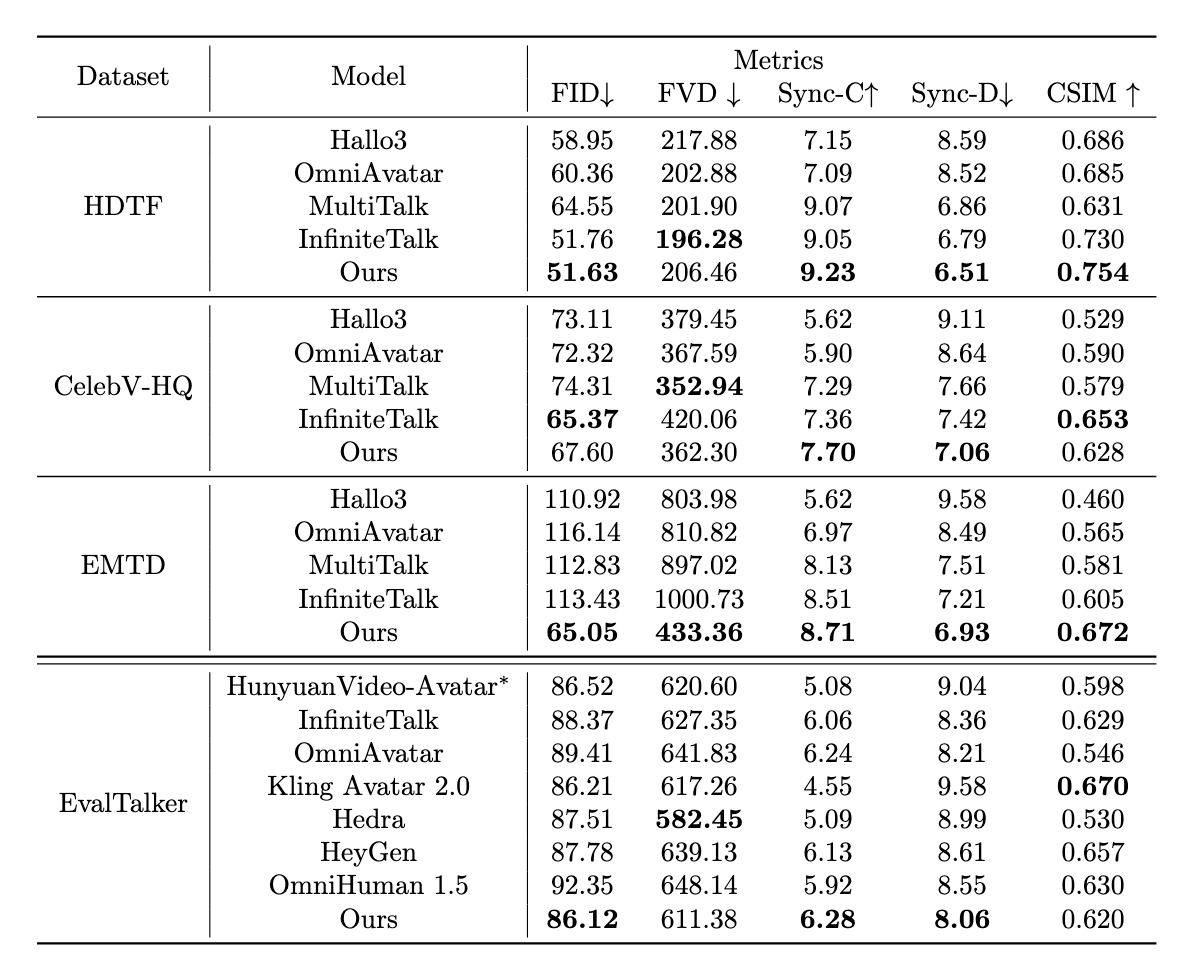 在 HDTF、CelebV-HQ 、EMTD 和 EvalTalker 等权威公开数据集上的定量评测表明,LongCat-Video-Avatar 在多项核心指标上达到 SOTA 领先水平。