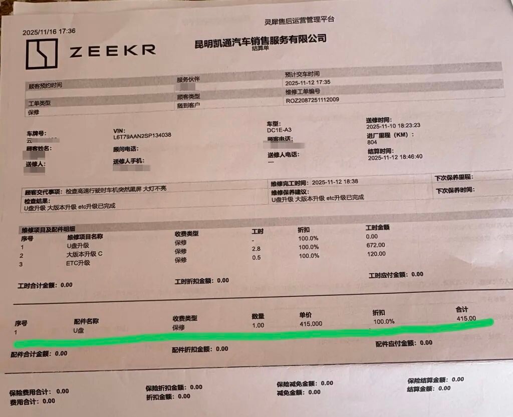 11月24日,门店通知周女士故障已修复,可随时提车。周女士提供的保修工单结算单显示,她的车辆维修项目为“U盘升级”、“大版本升级C”和“ETC升级”。除此之外,未对车辆故障深层原因做具体解释,也没有提供后台行车数据。
