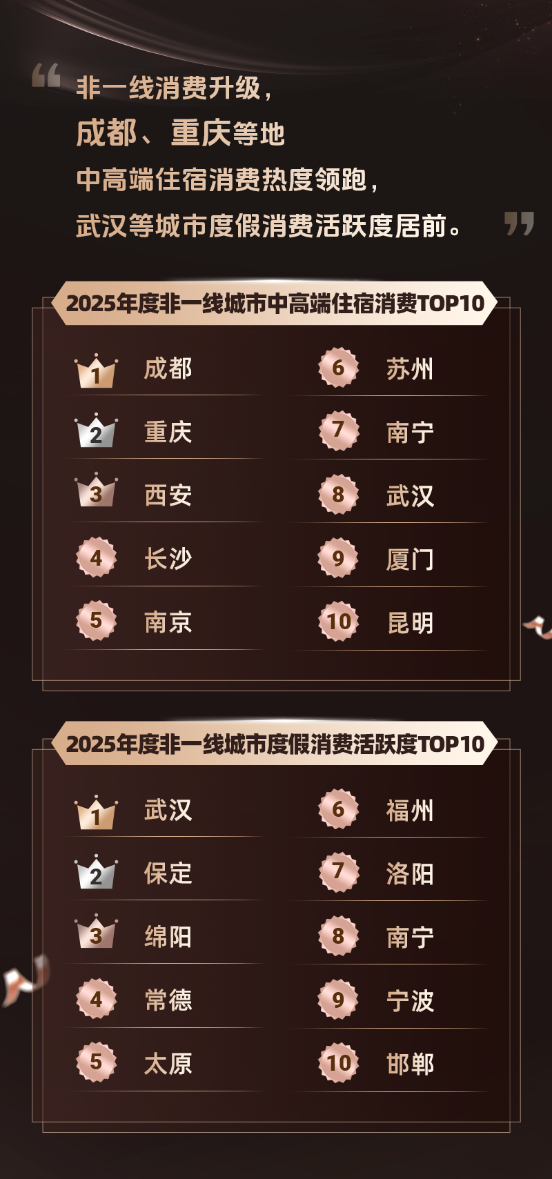 同程旅行发布的2025年非一线城市中高端住宿消费榜单显示,成都、重庆、西安等非一线城市的中高端住宿消费热度位居前列,其中既有来自跨地区游客的消费,也有来自本地及周边居民的短途休闲度假消费。