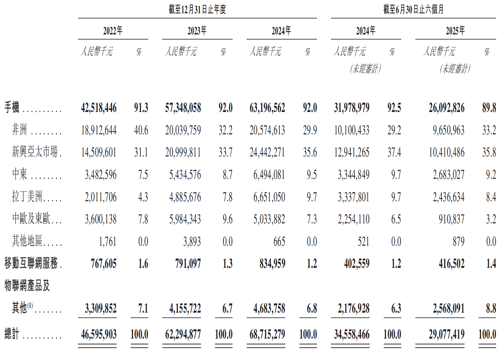 按照地域划分,非洲市场的营收贡献度最高,长期维持在三成左右。2022年至2024年,该市场收入分别为189.13亿元、200.40亿元和205.75亿元,呈现逐年上升态势。2025年上半年,非洲市场的收入曲线首次调头向下,同比下降4.45%至96.51亿元。与之对应的是,传音控股在非洲市场的手机销量由2024年上半年的5162.1万部下降18.90%至2025年上半年的4186.5万部。