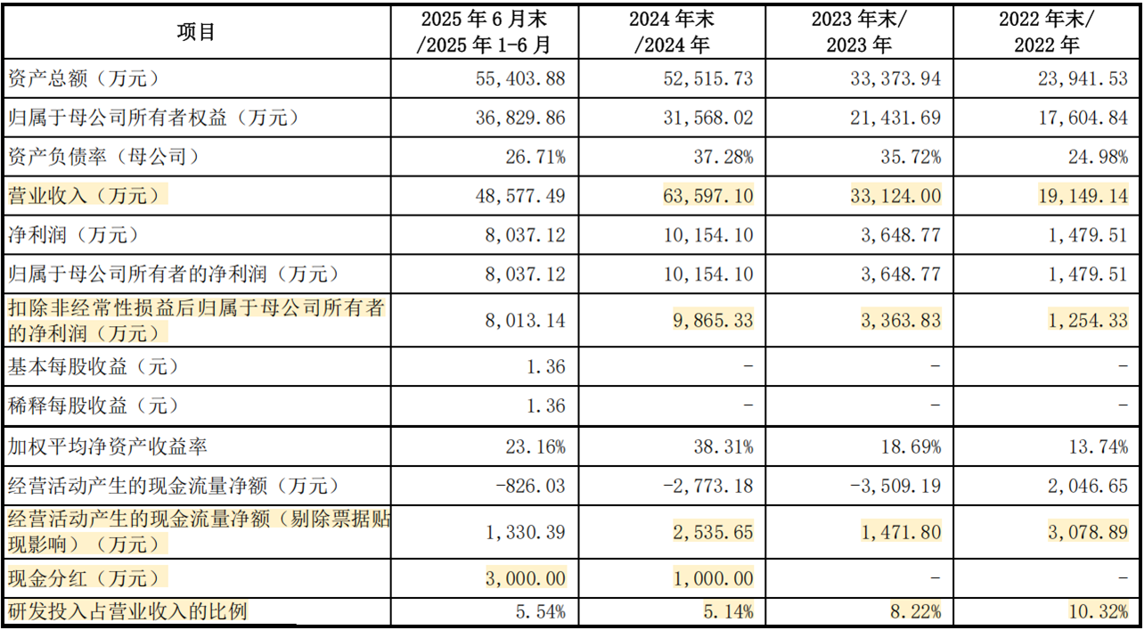 2022年至2024年,公司营业收入分别为1.91亿元、3.31亿元、6.40亿元及4.86亿元;归属于母公司所有者的净利润分别为0.15亿元、0.36亿元、1.02亿元及0.80亿元。