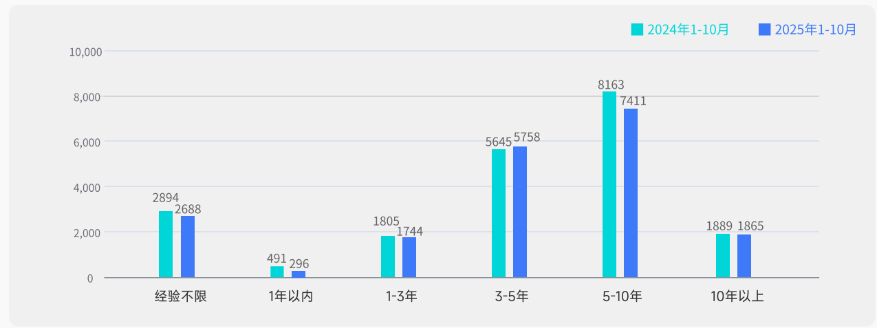 2024年1月-2025年10月,不同经验要求的新发岗位数量