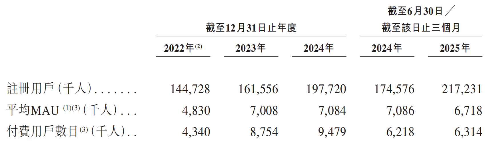 2022年至2024年及2025年上半年,活力集团的注册用户分别为1.45亿人、1.62亿人、1.98亿人和2.17亿人,其中付费用户分别为434.9万人、875.4万人、947.9万人和631.4万人,均呈现出持续增长的态势。