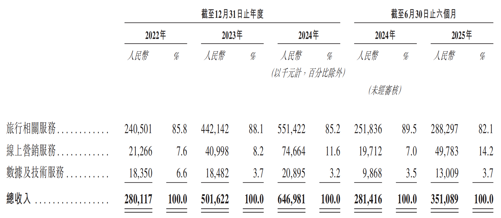 2025年上半年,活力集团的业绩延续了增长态势,其营收同比增长24.91%至3.51亿元,而净利润则同比增长48.50%至4709.2万元。在招股书中,活力集团将净利润增长的原因归结为“旅行相关服务及线上营销服务收入增加以及一般及行政开支减少”。