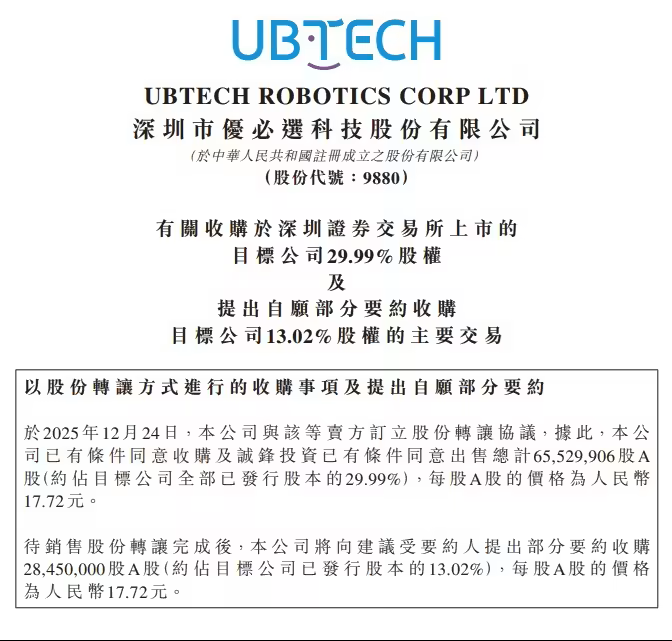 DoNews12月24日消息,优必选今晚发布公告,拟以“协议转让 + 要约收购”的组合方式共收购深交所上市公司锋龙股份 9395.75 万股(占锋龙股份公司股份总数 43.01%)。