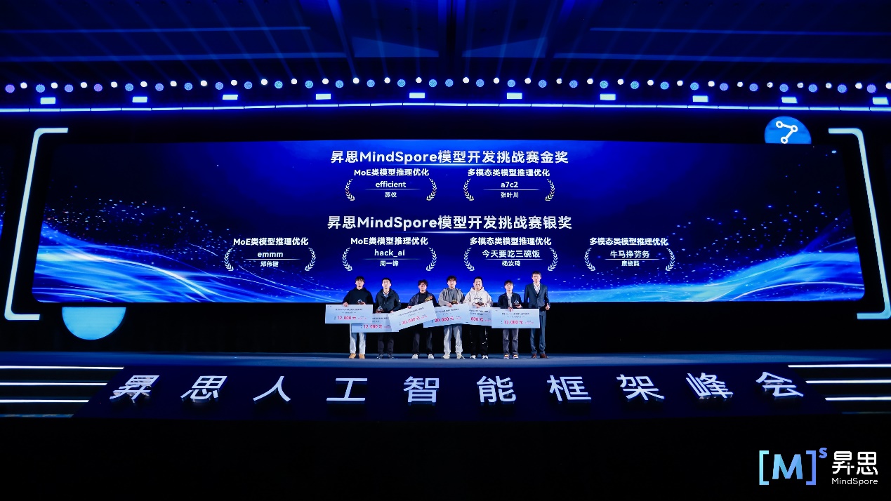 昇思MindSpore模型开发挑战赛聚焦前沿的MoE类和多模态类模型,考验参赛队伍在模型推理优化方面的实战能力,峰会上,本次挑战赛的金奖、银奖获奖选手接受颁奖。
