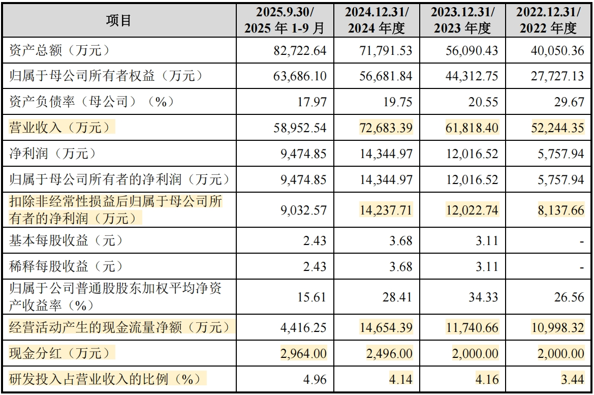 2022年至2024年分别实现营业收入5.22亿元、6.18亿元和7.27亿元,年均复合增长率17.95%;扣非后归母净利润分别为0.81亿、1.20亿和1.42亿元,年均复合增长率达32.27%。