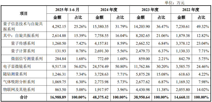 2022年至2025年上半年(简称“报告期”),公司来自量子信息技术与自旋共振系列的营收占比从49.32%降至25.26%,来自电子显微镜系列的营收占比从24.46%提升至56.02%,随钻测量、气体吸附分析、物联网等业务的营收占比相对较低。