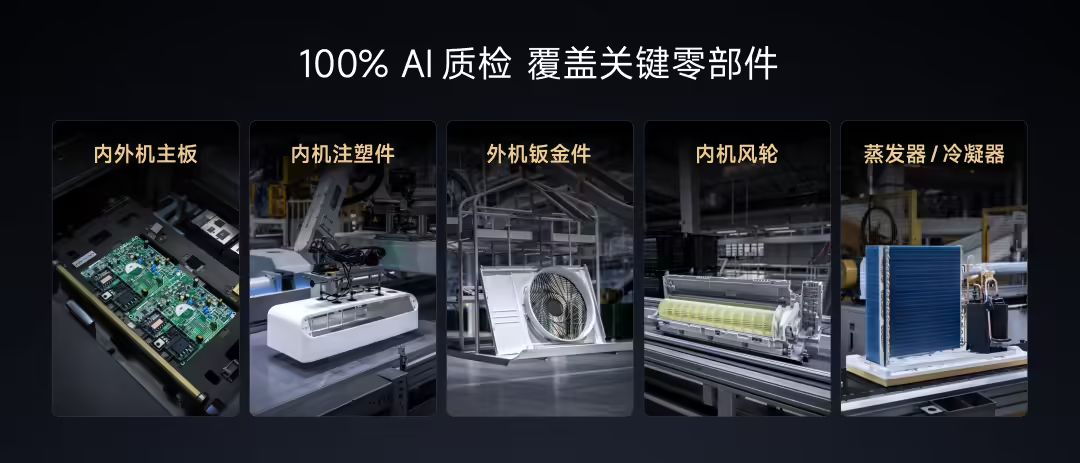 此外,该工厂还实现了关键部件 100% AI 视觉质检。传统制造往往只对整机进行全检,对零部件则采取抽检。小米智能家电工厂通过先进的 AI 视觉质检技术,实现了对内外机主板、注塑件、钣金件、风轮、蒸发器、冷凝器等关键零部件的 100% 高精度检测。高像素相机扫描结合端侧 AI 模型,检测既快速又准确。