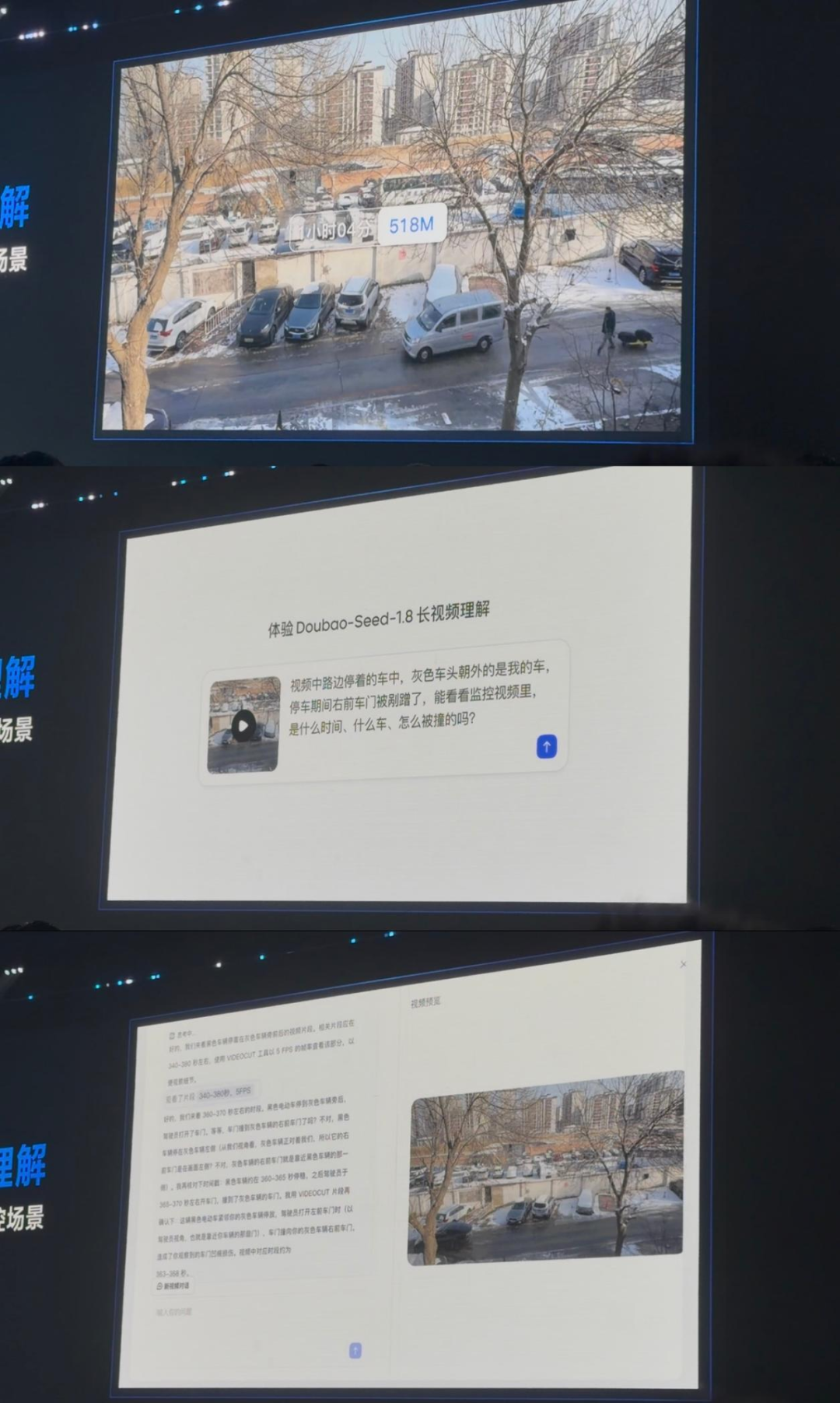 现场展示了通过豆包大模型1.8快速解析长时段监控视频,精准定位车辆剐蹭事故过程。在一段长达1小时4分钟的监控视频中,豆包大模型采用了一套高效的“分层解析”流程: