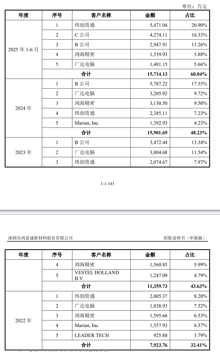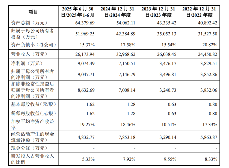 报告期内(2022年至2025年上半年),鸿富诚的营业收入分别为2.45亿元、2.6亿元、3.3亿元、2.62亿元;净利润分别为3829.51万元、3476.17万元、7150.51元、9074.49万元。