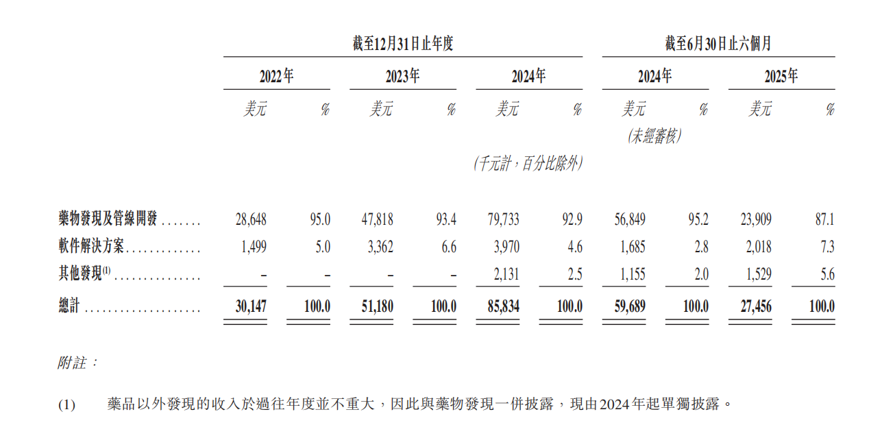 从财务模型上看,于2022年、2023年、2024年,大部分收入来自药物发现及管线开发,分别占95.0%、93.4%、92.9%,为2864.8万美元、4781.8万美元、7973.3万美元,且增长率达到66.9%和66.7%,反映出管线价值兑现的强劲加速。