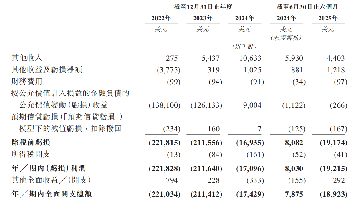 于2022年、2023年、2024年及2025年上半年,公司亏损净额分别为2.218亿美元、2.116亿美元、0.171亿美元及0.192亿美元。