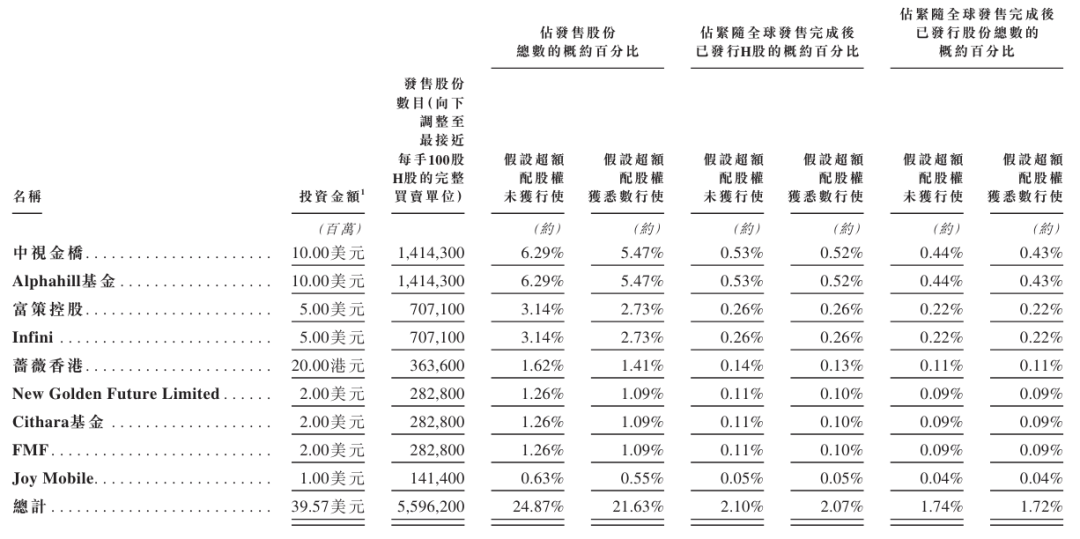 迅策基石投资者分别为中视金桥、Alphahill基金、富策控股、Infini、蔷薇香港、New Golden Future、Cithara基金、FMF、Joy Mobile,一共认购3957万美元。