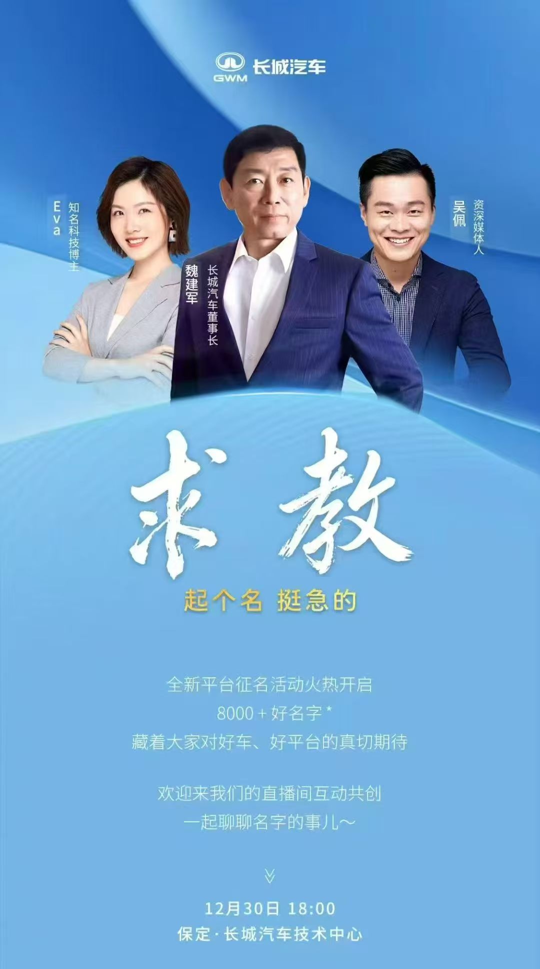DoNews12月30日消息,长城汽车总裁魏建军在社交平台宣布,将于今日18:00开一场直播,与大家聊聊长城一车多动力平台的取名问题。